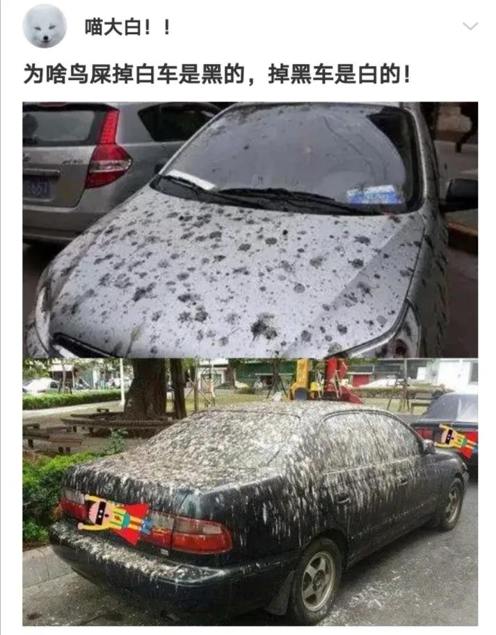 最后,谜底揭开了!黑车上鸟屎是白色,那是因为白色尿的部分更明显;白车上鸟屎是黑色,那是因为黑色屎的部分更明显,其实是因为车身颜色产生的错觉!