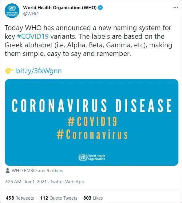 世卫组织(WHO)宣布新冠病毒主要变异毒株的新命名方式